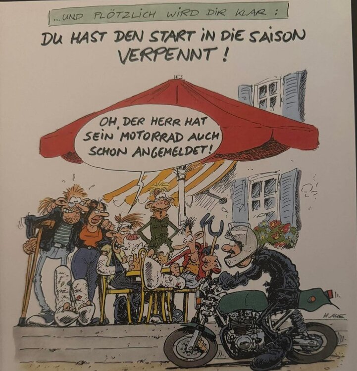 Oh ja, Trecker. Da war mal was. Hatte mich einer Gruppe von Bikern angeschlossen und wir fuhren schön durch das Bergische Land an saftigen Wiesen vorbei. Es geht abschüssig eine engere Straße herunter und auf einmal kommt ein Riesentraktor um die Kurve. Ich weiche instinktiv mehr nach rechts aus, gerate aber auf den Rasenrand, gerade noch an einem Pflock vorbei und dann hat mich die Blickführung magisch weiter nach rechts geführt, in einen leichten Graben, Beine ausgeklappt und ich konnte ausrollen, um am Ende stehend nach rechts umzufallen. Da lag ich weich gebettet im Gras, halb unter dem Motorrad, bis die anderen Fahrer herbeikamen um gemeinsam die Yamaha wieder auf die Straße zu schieben. Kurzer Check, nichts Wildes, der Trecker war längst weg, und danach habe ich die Gruppe auf eine Kaffeerunde im Café eingeladen. Mit einer Vollbremsung hätte ich übrigens alles nur verschlimmert, gerade als ich auf dem Rasenbereich war. Im Nachhinein war es die suboptimalste Lösung, auch wenn es kein schönes Gefühl ist, wie eine umgedrehte Schildkröte in der Wiese zu liegen.