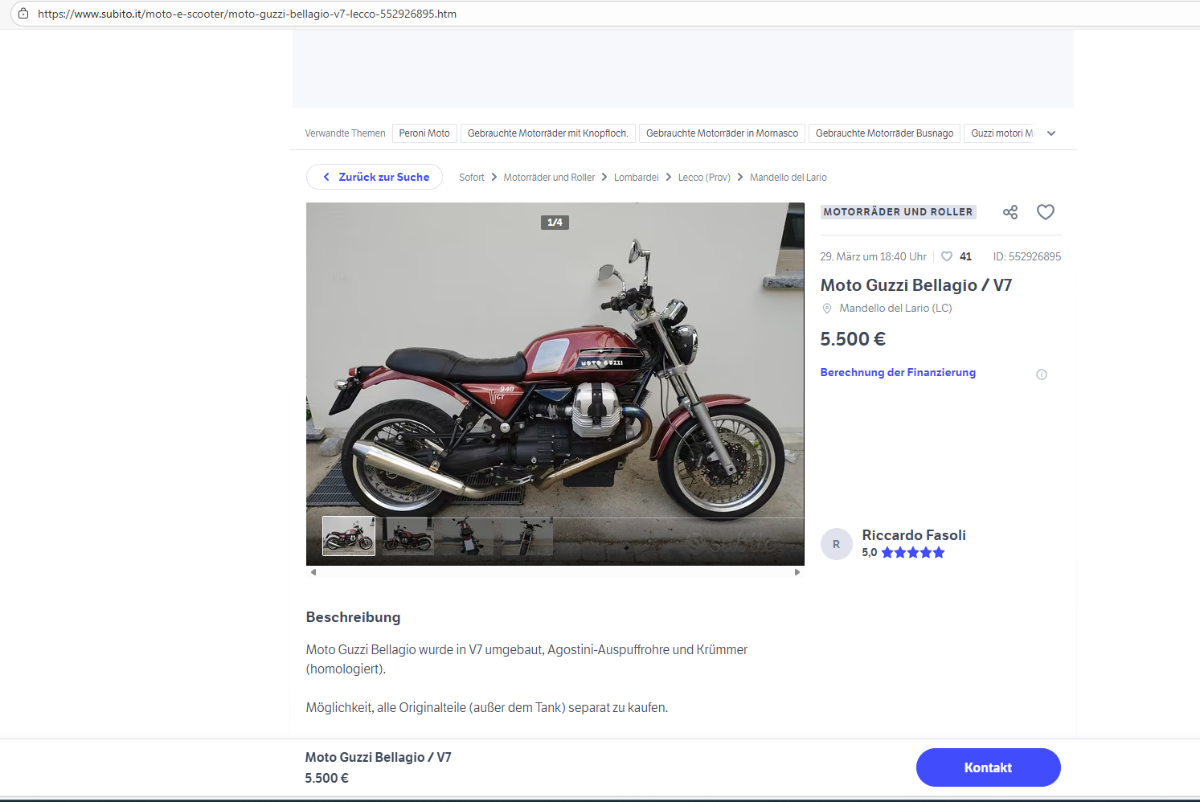 so klein ist die Welt (Guzzi-Welt) 😉 für interessierte HIER der Link zur Anzeige: https://www.subito.it/moto-e-scooter/moto-guzzi-bellagio-v7-lecco-552926895.htm und für GRISO Suchende auch ein Link, der Weg lohnt sich. https://www.subito.it/annunci-italia/vendita/moto-e-scooter/?q=moto+guzzi+Griso Gruß Holger