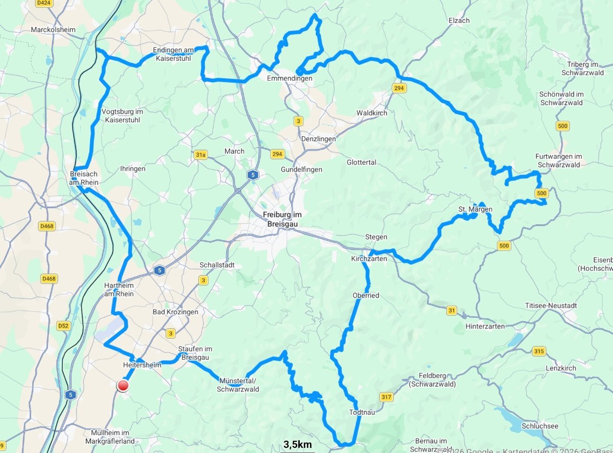 Ich bin gestern in dieser Saison zum ersten Mal wieder im Schwarzwald gefahren. Als ich um 10:00 Uhr los fuhr waren es gerade mal 9°C und hab mir überlegt ob ich mir das antue. Wir hatten aber eine Inversionslage d.h. es war Oben wärmer als in der Rheinebene . In den Schattenlöchern musste jedoch aufpassen die Straßen waren nass und das Laub klebte darauf. Ein bisschen Schnee lag auch noch ansonsten ließ es sich gut fahren bei sehr wenig Verkehr. Knapp 250 km sind es geworden vom Schwarzwald über den Schutterwald zum Kaiserstuhl mit Vesperpause am Rhein .