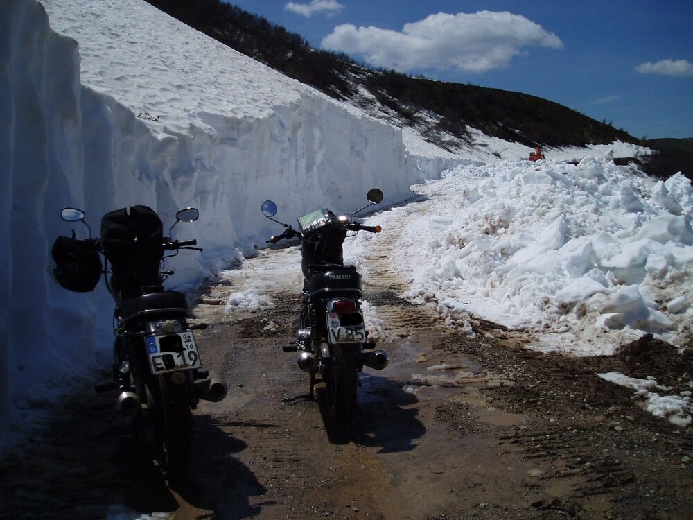 Oh, da muss ich mal alte Bilder heraussuchen. Indien - Royal Enfield - Rotang Pass auf 4.000 Meter Höhe und sehr viel Schnee. 🙂