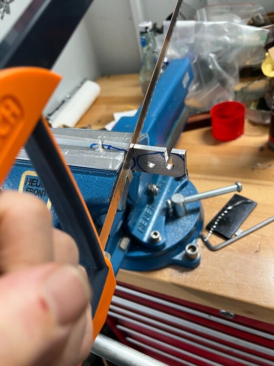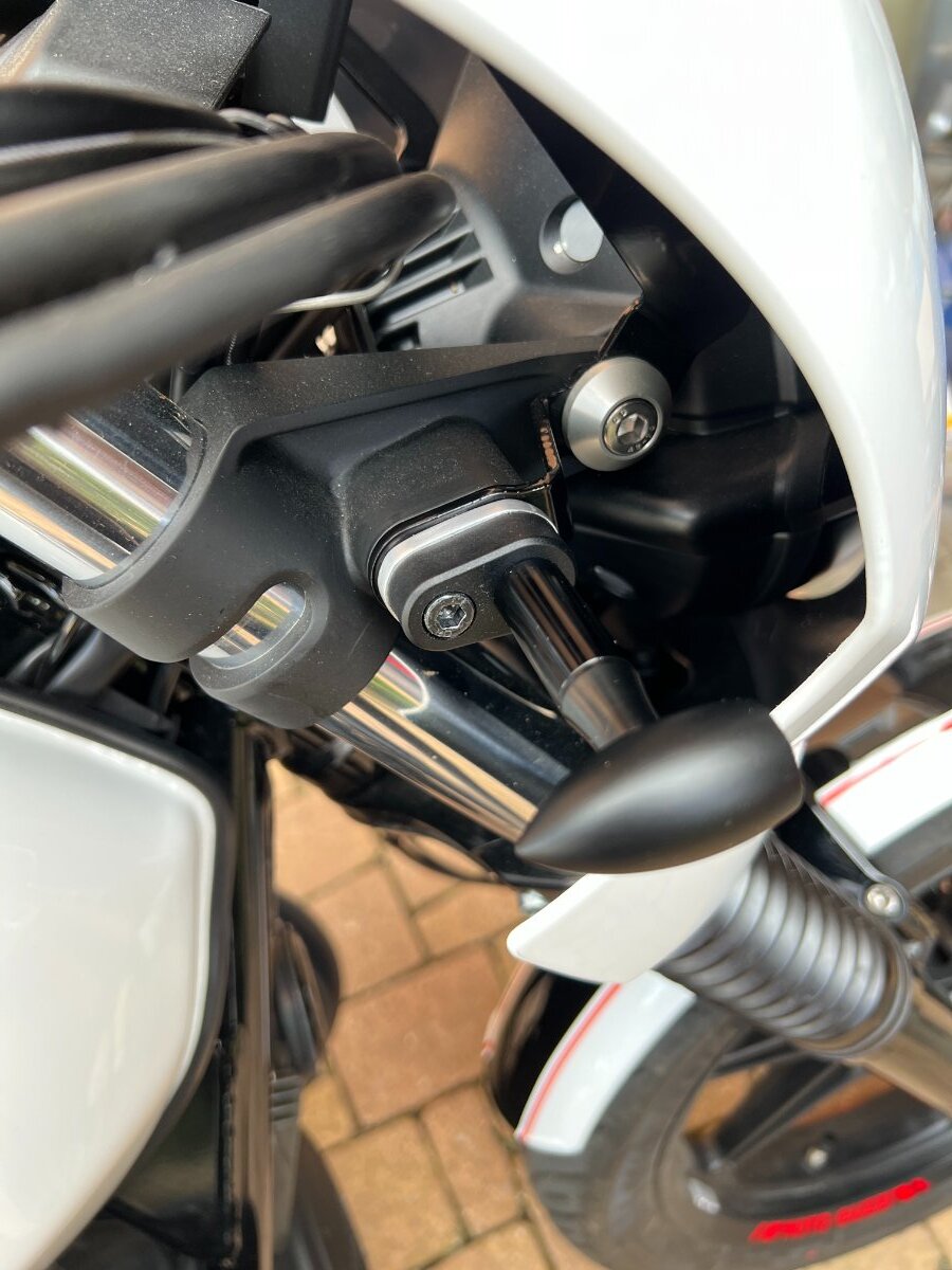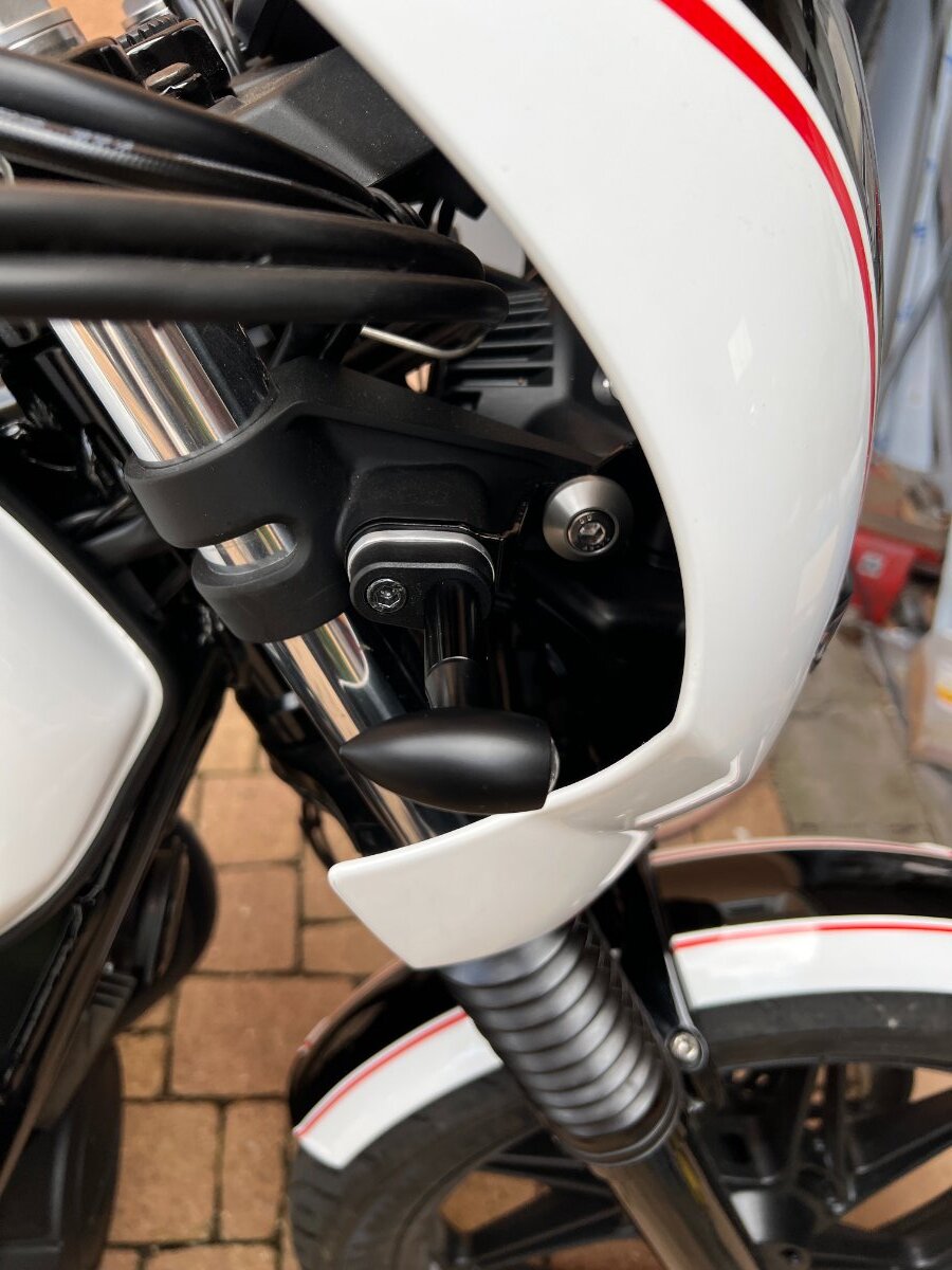 Die Montage der Verkleidung ist wirklich simpel ... allerdings hatte ich ja die Blinker ausgetauscht ... und die brauchten nun Verlängerungen ... und dannach fehlten immer noch 5 mm damit die Vorschriften erfüllt sind. Da ich keine Lust hab mich unterwegs wg. 5mm aus dem Verkehr ziehen zu lassen habe ich also was passendes gefeilt (wozu so ein Schraubstock in Verbindung mit einer Handsäge, Feile und Bohrmaschine doch gut ist ) Auch mal wieder ein typisches Beispiel dafür, dass im Regelfall selbst simple Kleinigkeiten dann doch mehr Zeit kosten als erwartet ... -
