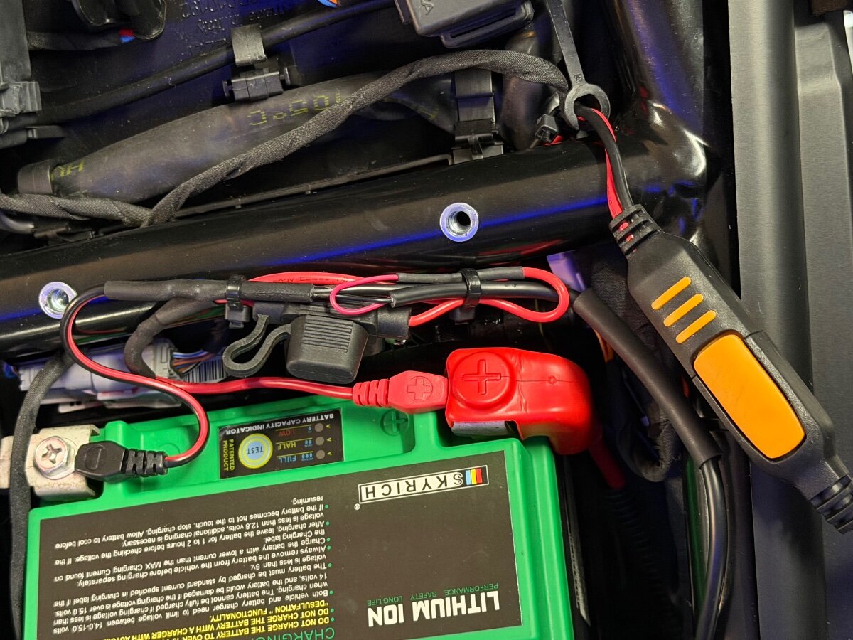 Sodala, hier der versprochene Weg für die elegante Verlegung des Dauerstroms fürs Navi: Seitenverkleidungsteile links abbauen (Werkstatthandbuch hilft) (Windschild muss man nicht abmontieren) Kabel innen über den oberen Gelenkpunkt führen, dann scheuert es nicht Kabel weiter nach vorne unten führen; links am Radarsensor nach schräg rechts hinten durchstecken; ggf wie ich mit einer Kabelzug-Hilfe… …es kommt dann im Bereich der Gabelbrücke raus am Cockpitkabelbaum. Von dort weiter, hinter dem Kühlerdeckel, weiter am Hauptkabelbaum entlang… …immer elegant hinter dem Hauptkabelbaum versteckt verlegen, bis zum Sitzbankbereich. (die Originalbatterie habe ich getauscht gegen eine Lithium-Ionen-Batterie) An der Batterie habe ich vom Ctek-Ladegerät die Daueranschlüsse/ Ösen an den Polen der Batterie festgeschraubt und vorher das Kabel des Navis samt Sicherung an die Ladegerät-Kabel dazugelötet und sauber verschrumpfschlaucht. Die Lötarbeit hat ein Freund gemacht und hat 5 min gedauert. (so kann ich das Ladegerät nach jeder Fahrt bequem per Cteck-Steckverbindung anschließen.) das sieht schick und professionell aus, wie ich finde. Hier noch die Bilderserie in der chronologischen Sequenz. Ich hoffe ich kann dem Einen oder Anderen eine Stütze sein bei seinem Vorhaben. 🥳 Dank an Klaus-Dieter für die initialen Tips bzgl der Halterungen… -