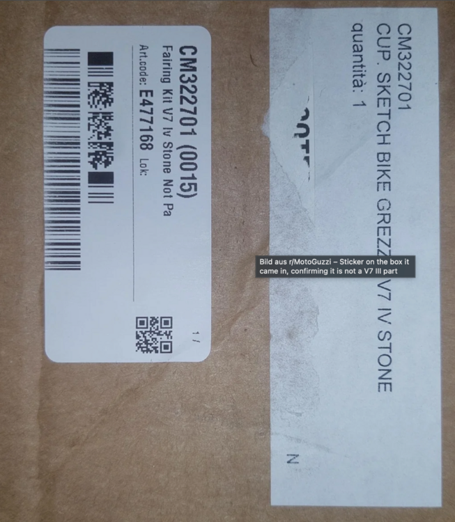Danke für die Frage, denn hier sind alle Modelle der V7 ab Bj.25, also die mit E5+ betroffen und nicht nur die Sport. ABE hat die Verkleidung nicht. Entwickelt wurde die Verkleidung für die Corsa und das war eine V7 IV Stone als Sondermodell. So steht es auch auf dem beiliegenden Aufkleber. (siehe Foto) Streng genommen also nur hierfür zugelassen. Die Prägung in der Verkleidung weisst sie als Originalteil aus. (siehe Foto) Das sollte helfen, in der Diskussion mit den Freundlichen oder wenn man sie eintragen will. Denn wenn man sicher gehen will, lässt man sie sich eintragen. Ein spitzfindiger der Rennleitung könnte hier das Diskutieren anfangen. -