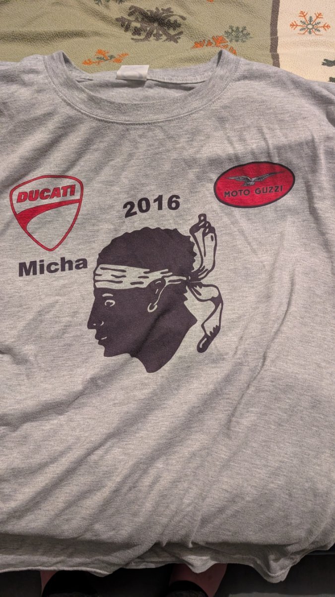 Hier das selbst entworfene Shirt unseres Korsika-Urlaubs, das unser Shirt-Drucker umgesetzt hat, Meine Frau mit der Monster und ich mit der Breva unterwegs. Ein Erinnerungsstück für die Ewigkeit.