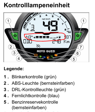 Moin, ich habe heute meine erste Ausfahrt mit dem neuen Motorrad machen können und war natürlich auch noch tanken. Mich wunderte etwas, dass die Tankanzeige beim Einschalten der Zündung kurz zu sehen ist (Display Selbsttest) und nach 2-3 Sekunden dann das normale Display zu sehen ist ohne Tankanzeige...soweit ich nachlesen konnte ist das wohl normal so, da der Italiener eher nach Tripkilometer fährt, anstatt nach Anzeige. Scheinbar noch ein Unterschied von der Sport zur Stone, die Sport...schade, aber nicht so tragisch. Die 6 Balken (im Bild rot markiert) werden bei meiner V7 Stone also nie angezeigt, auch nicht wenn der Tank fast leer ist? Nur das kleine orangene Symbol (Nummer 5) mit der Zapfsäule? Damit kann man ja noch so 100km fahren, sind anscheinend 4-5L oder? Danke!