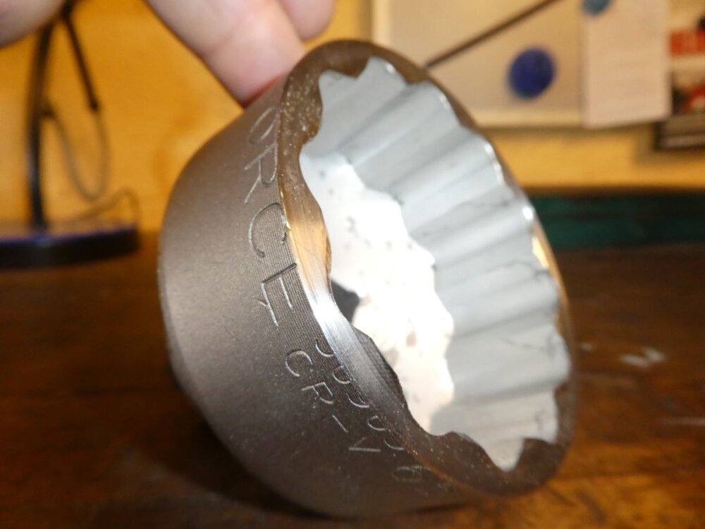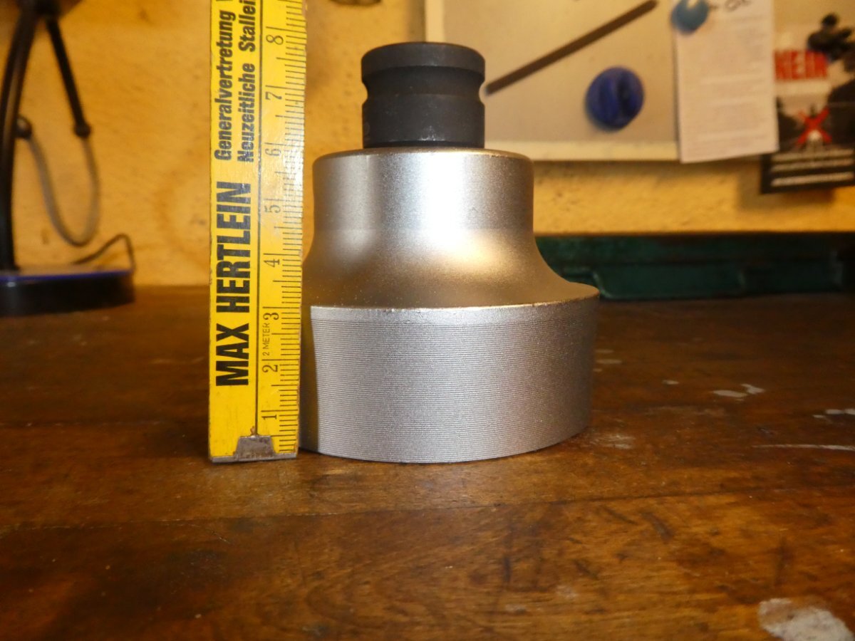 Das ist das andere Problem. Ich habe eine ziemlich kurze 3/4"-Verlängerung, ich glaube, nur 75 mm lang, und mit der nicht-abgedrehten Nuss und der kurzen Verlängerung komme ich mit der Ratsche gerade nicht mit Rad oder Felge in Kontakt. Wenn ich abdrehen lasse brauch ich auch ne andere Verlängerung 🤨