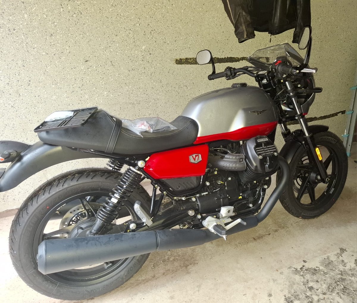 Komme gerade von weiteren 30 Kilometern "Einfahren" mit der seit dem 7.12. neuen V7 Stone Corsa. Heute wurden auch mal die Reifen etwas warm, so dass ich hier etwas vertrauter werde. Tja, da musste ich erst 63 sein, um nach dem Führerschein 1981 zu einer Guzzi zu kommen. Yamaha XJ600, Kawasaki ZXR400 und Z750S, alle schön und gut aber die Guzzi ist ein komplett anderes Fahren. Sie erinnert mich stark an die Dutzenden Ausfahrten in Indien mit einer Enfield während diverser Reisen (bis hoch auf 5.600 Meter (Khardung La Pass)). Dieses Brubbeln unter dem Popo, die Kraft aus allen Drehzahlen, die Eigenheiten wie das Suchen des Leerlaufs und das Klacken beim Hochschalten. Mal sehen was ich mit der italienischen Diva so noch erlebe....