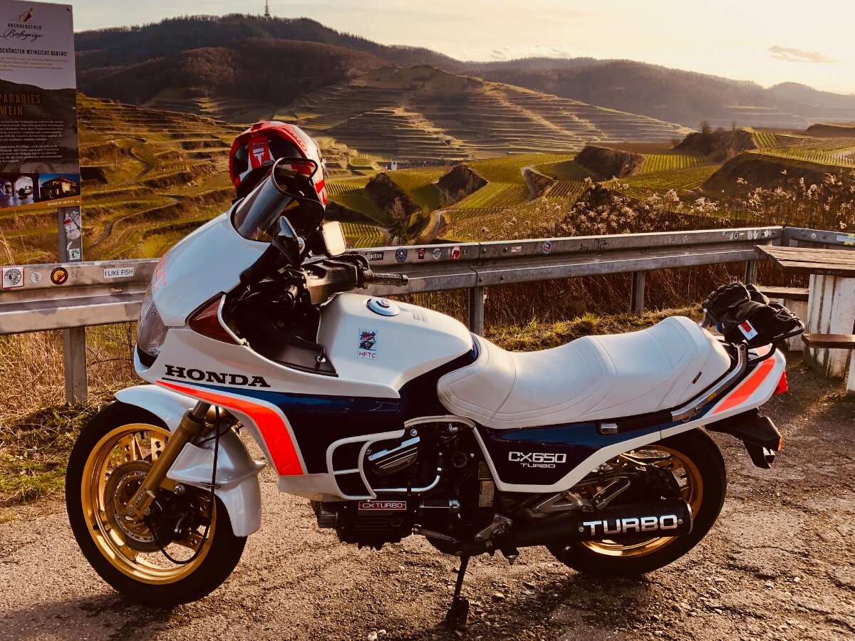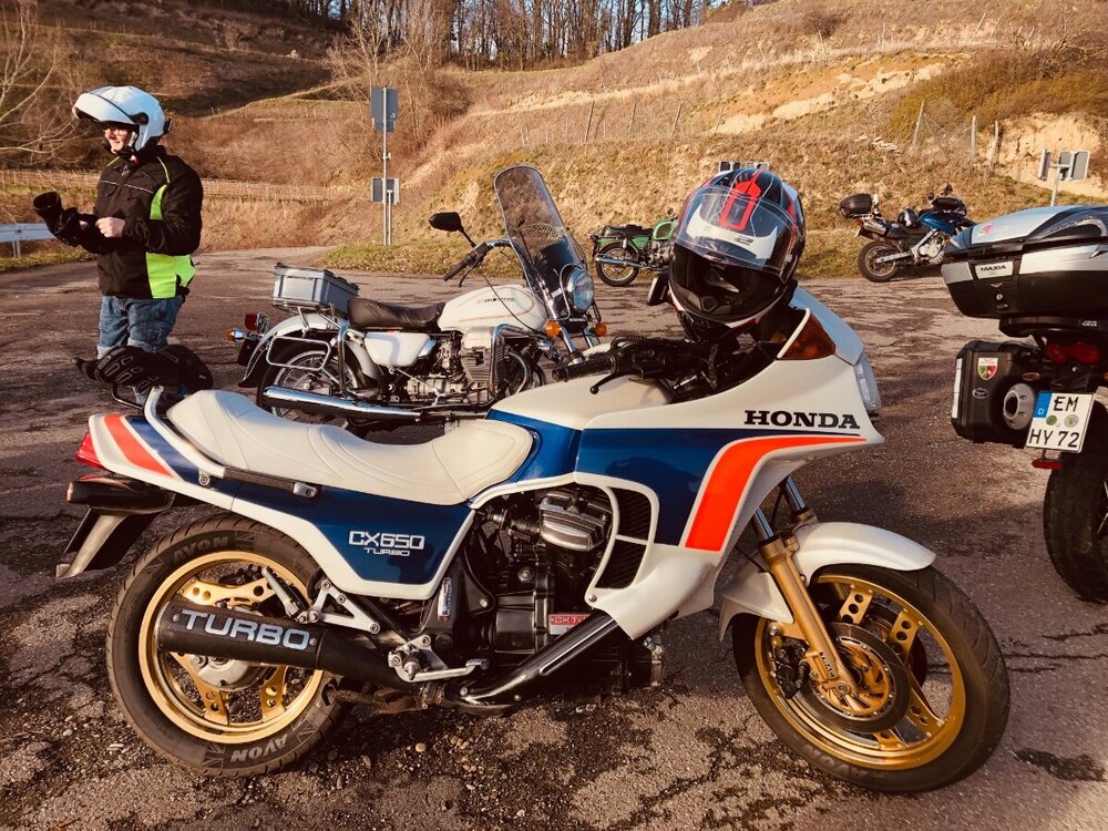 2. Hallo, ein sehr seltenes Motorrad, zufällig am Texaspass im Kaiserstuhl getroffen. Eine Honda CX 650 Turbo. Die CX 500 ist schon selten und habe ich noch nie im Strassenverkehr gesehen. Die hier abgebildete CX 650 ist noch viel seltener verkauft worden in der kurzen Ära der Turbo Motorräder. Der Besitzer freute sich über mein Interesse am Bike und verriet mir noch eine zweite zuhause zu haben. Eine schöne zufällige Begegnung. LG Uwe