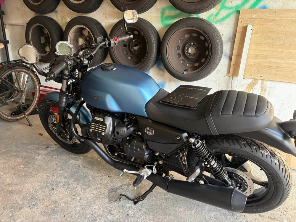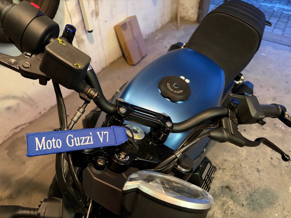 Moin, ich habe im September 2025 meinen A Führerschein gemacht und mir nach ein paar Probefahrten verschiedener Motorräder eine Moto Guzzi V7 Stone in Blau gekauft 😃 Meine Anpassungen sind: Lenkerenden-Spiegel von der Sport Sturzbügel Schwarzer Tankdeckel Jetzt muss es nur noch wärmer werden