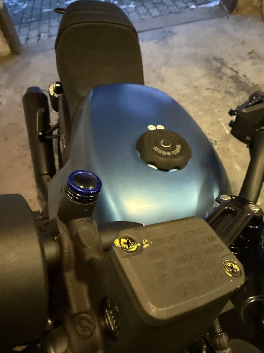 @VinoGuzzi Ich habe leider noch keine "schönen" Bilder. Vor der Garage liegt noch Schnee und das will ich der Guzzi wirklich nicht antuen Da ich ja Lenkerenden-Spiegel nutze habe ich in die alten Gewinde M10 Spiegelstopfen in Blau gesetzt. Passt farblich leider nicht ganz aber egal -