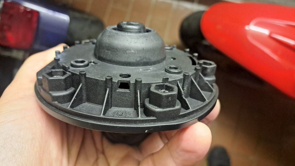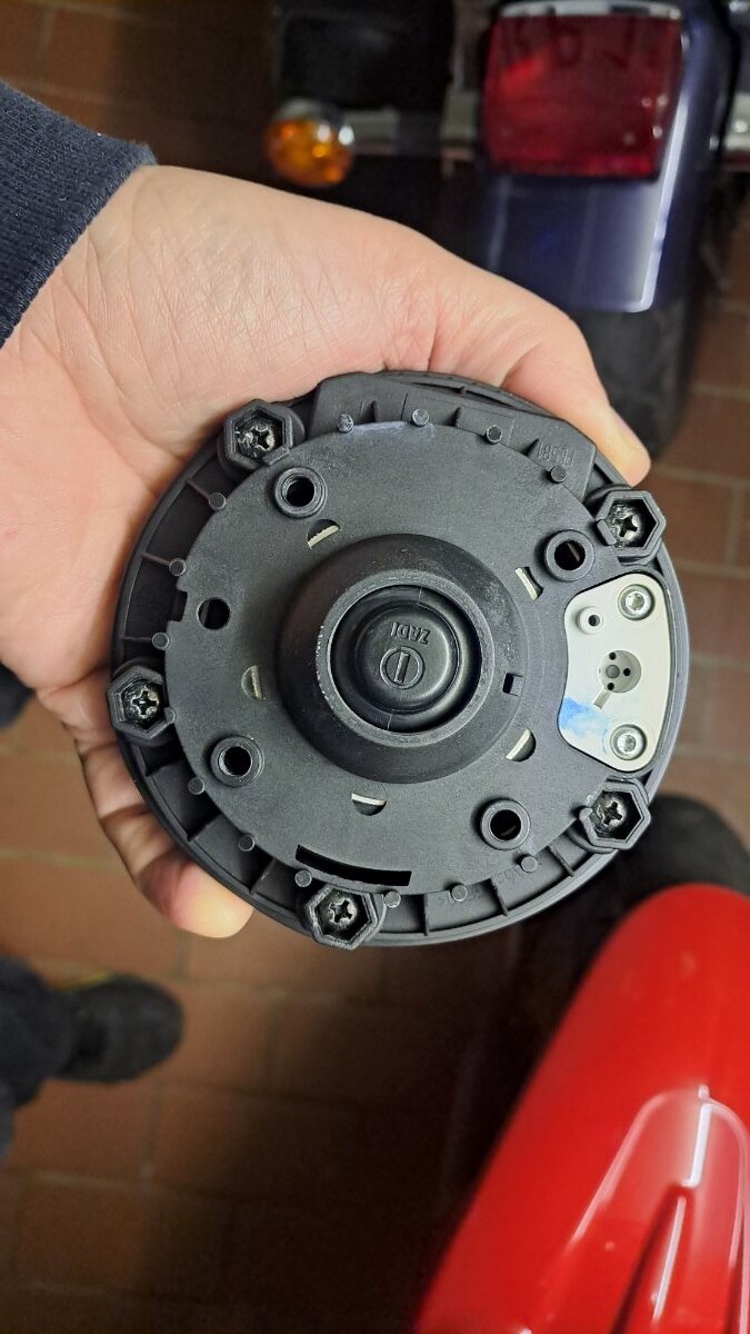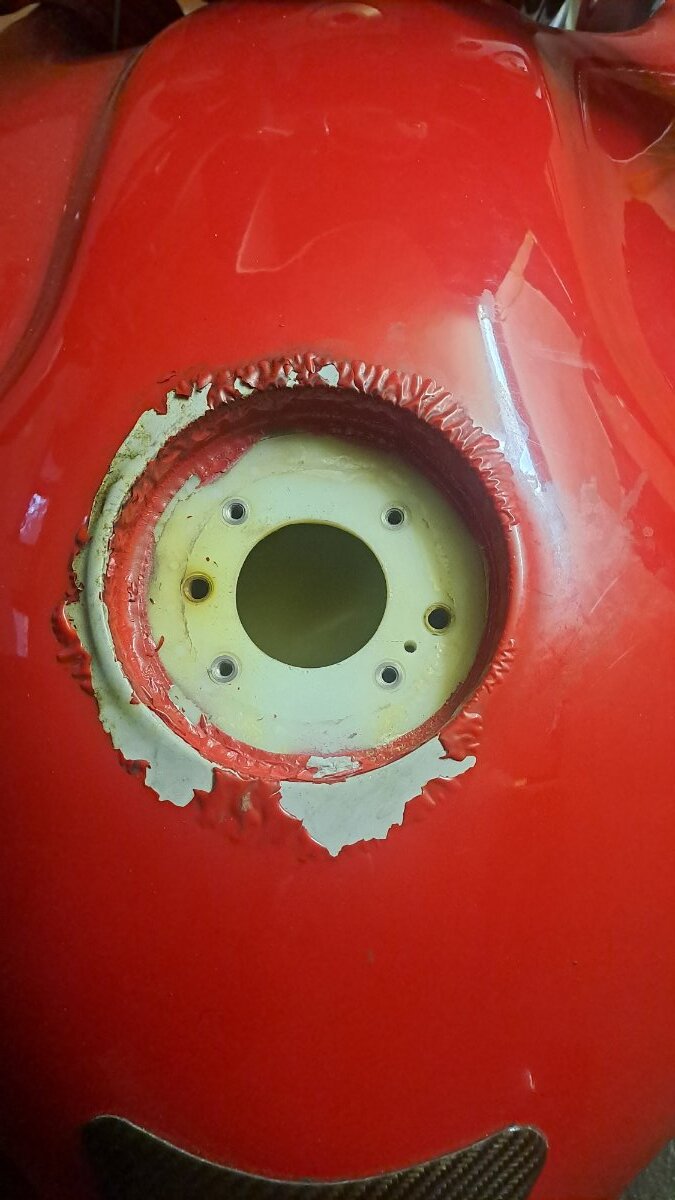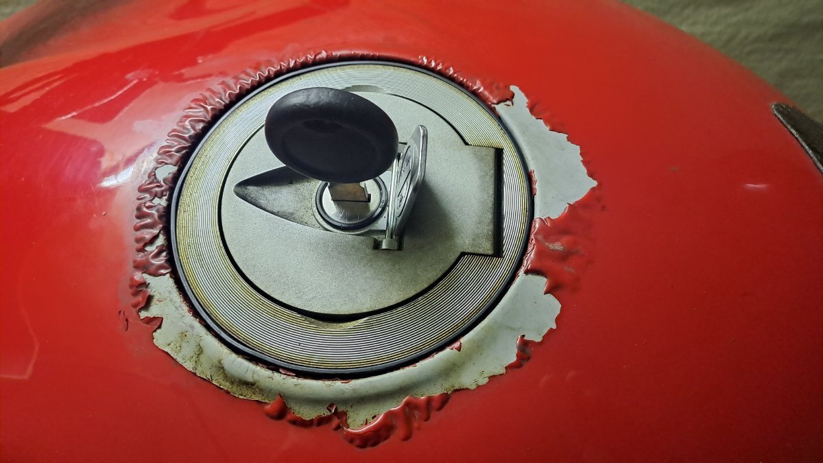 Okay, hier wird also nun versucht, der Sache mal ein wenig auf den Grund zu gehen... 1. Bild: Die vier Gewinde im Quadrat im ersten Bild halten den Tankdeckel - die sind ohnehin schon mal dicht. Die beiden größeren Löcher (halbwegs horizontal) führen in abgeschlossenen GFK-Leitungen runter zur Kraftstoffpumpe. Hier wird anscheinend Luft gezogen? Das kleine Loch ist offenbar für ein Ventil (das weiße Ding an der Unterseite des Tankdeckels). 2. Bild: Der Tankdeckel ruht auf 4 kleinen Sockeln für die Befestigungsschrauben. Zwischen dem Tankdeckel und dem GFK des Tanks bleibt also ein ca. 1 mm breiter Luftspalt, aus dem die beiden Leitungen zur Kraftstoffpumpe ziehen können? Weil keine Dichtung zwischen dem großen, runden Loch in der Mitte des GFK-Tanks und dem Tankstutzen in der Mitte des Deckels vorhanden ist, kann der Raum zwischen Tank und Deckel gar nicht dicht sein und soll es anscheinend konstruktiv auch nicht sein. 3.Bild: Das scheint mir bestätigt zu werden durch die kleine Öffnung vorne in der Mitte sowie die Verriegelung rechts, welche Luft zwischen Spalt und Außenbereich des Tankdeckels zirkulieren lassen. Bei hinreichender Schräglage oder wenn das Motorrad hinfällt, würde m.E. zwangsläufig Benzin durch die vielen Luftspalte in den Außenbereich des Tankdeckels schwappen. Hier steht dem Benzin dann nur noch die dünne Gummidichtung im Weg, die den Tankdeckel gegen die Lackierung des Tanks mehr schlecht als recht abdichtet und ringförmig um den Tankdeckel verläuft (etwa da, wo mein kleiner Finger hinzeigt). 4.Bild: Wenn ich den Tankdeckel locker in die Öffnung dafür einlege, also ohne Festschrauben, dann hat er nach allen Seiten hin ca. 1 Millimeter Spiel! Au weia... Fazit: Nach meiner Auffassung kann diese Konstruktion gar nicht dicht gegen Benzin sein und konnte es nie sein. Kann mir bitte ein Motorradschrauber oder Ingenieur mal erklären, was die Konstrukteure sich dabei gedacht haben? Meine alte Else hat einen primitiven Schraubverschluss wie an einem Marmeladenglas und der ist dicht! Sie hat zugegeben auch einen relativ druckfesten Tank aus Stahl, gewölbt in Tropfenform, also sehr widerstandsfähig. Obwohl ich verstehe, das der Tank eine Be- und Entlüftung braucht, scheint mir das eine sehr komplizierte und fehleranfällige Konstruktion zu sein. Was mich verblüfft ist, dass dieser Fehler mit dem aufquellenden und abplatzenden Lack doch schon Tausende von Malen aufgetreten sein sollte bei Brevas, Grisos, Stelvios usw.? Bin ich denn der Einzige, dem das passiert ist? Ich hoffe, dass jemand da mal ein wenig Licht ins Dunkel bringen kann, danke dafür im voraus! Bernd