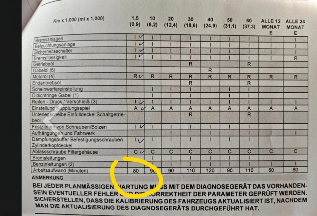 Der Arbeitsaufwand, wäre ÖL ablaufen lassen, Filter wechseln, Luftfilter ebenso, Sichtkontrollen zwischendurch Bremse, Bremsflüssigkeit Undichtigkeiten. Man kennt die üblichen Verdächtigen. Ventile einstellen dauert nochmals 20 Minuten. Ich behaupte in einer Fachwerkstatt mit Mechanikern die das alles täglich machen alles zusammen 45 Minuten. Länger bräuchte ich nicht. Als nicht-Italiener versteht ihr das aber nicht, eigentlich sind es 45 Minuten technische Arbeit plus 45 Minuten Diskusionen mit dem Cheffe und Cappuccino trinken dabei. Grüße , mako
