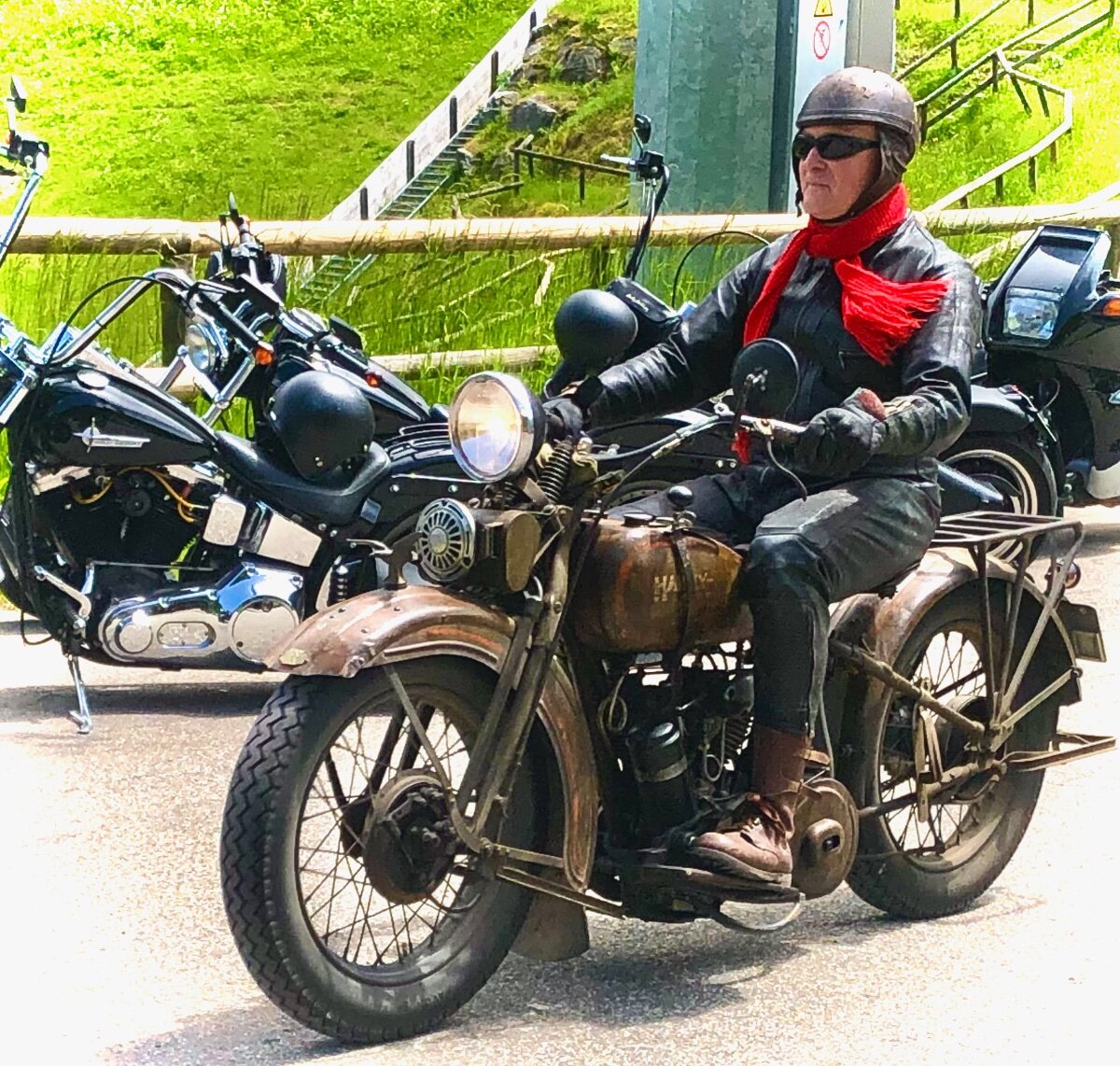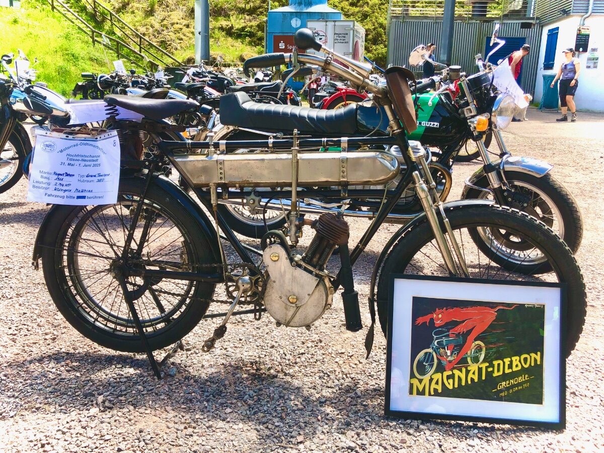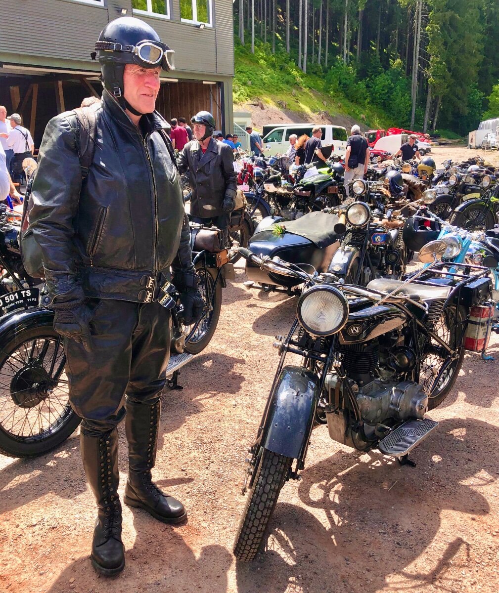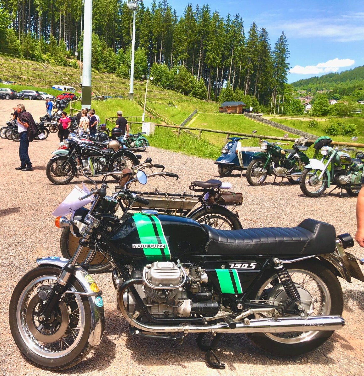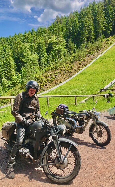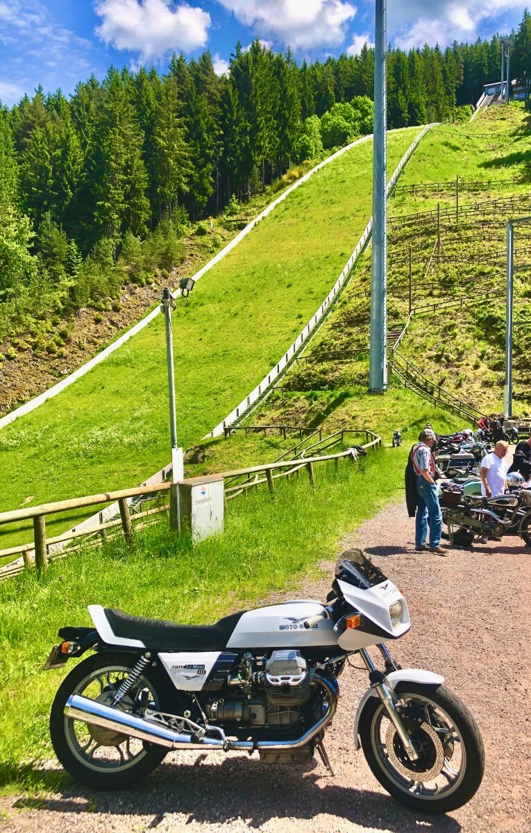Hallo, in einem kleinen Seitental bei Titisse-Neustadt liegt etwas abseits die große Hochfirst Schanze. Auf dieser Schanze werden jährlich Weltcups im Skispringen ausgetragen. Aber nicht nur im Winter lohnt ein Besuch auch im Sommer kann es sehenswert sein. Besonders wenn das jährliche Treffen für Motorrad Oldtimer stattfindet. Im Auslaufbereich des Aufsprunghügels treffen sich die verschiedenen Bikes. Die ein oder andere Guzzi ist natürlich dabei... ...die angereisten Oldtimer sind aber sehr vielfältig. Alles ist vertreten, genauso sehenswert sind allerdings auch die Besitzer... ...gerne werden die Schätzchen präsentiert. Auch das Outfit passt hervorragend. Besitzerstolz macht sich allerorten breit. Am späten Nachmittag treten die ersten die Heimreise an. Freundlich wird zum Abschied jedem gewunken. Erfahrene Fahrensmänner mit ihren zweirädrigen Lieblingen. Auch bei kleinen Motoren ist der Besitzerstolz nicht minder groß. So treten wir denn auf den Guzzis die Heimreise an, mit der Gewissheit nächstes Jahr wieder zu kommen. LG Uwe9 points