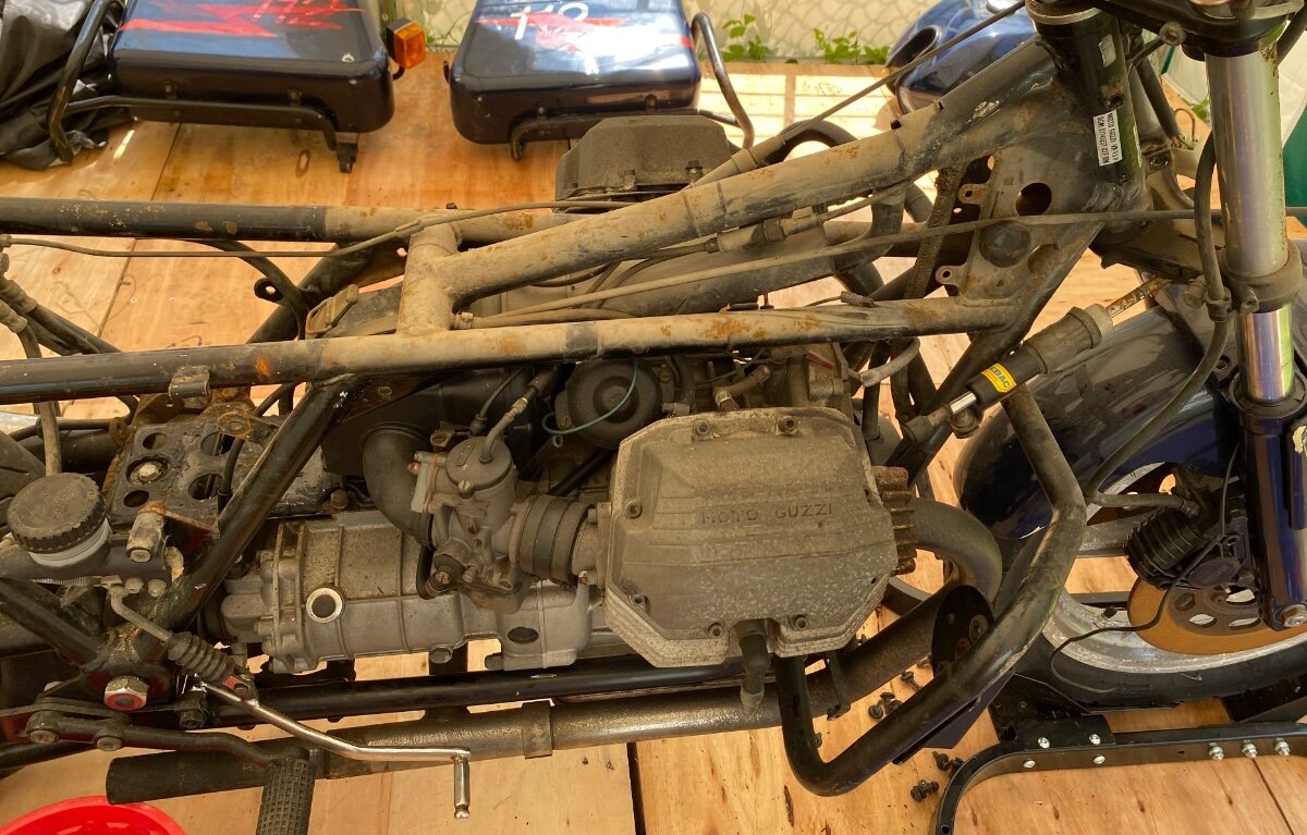Liebe Guzzifreunde, manch einer wird sich fragen, "mein Gott was tut denn der da". Ich hatte im Frühjahr 2025 eine etwas heruntergekommene V65 gefunden und beinahe geschenkt bekommen. Erst zuhause sah ich dass es sich um eine Lario mit dem Vierventilmotor handelt. Die Guzzi war seit circa 15 Jahren herumgestanden und nicht bewegt worden. Wie gesagt, furchtbarer Zustand, von Originalteilen keine Rede, aber der Motor drehte sich und der Gedanke alles was so im Lager herumliegt zu verwenden, kam mir in den Sinn. Das Ergebnis ist ein abgespecktes Lario/Bobber/Caferacer/Irgendwas-Derivat, das sehr leicht ist und überraschend Freude zu fahren macht, niedrig, fahrradleichtes handling, speziell mit neuen Lagern in Rädern, Lenkkopf und Öl in den Gabelholmen. Geht wie der Teufel.... Da beide Armaturen vom Zeitzahn zerfressen waren und sich im Lager ein digitaler DZM und ein GPS Tacho fanden, wurde ein Alurahmen gepuzzelt und auf das schon improvisierte Zündschloss/Leuchtenblech gesetzt. Funktioniert bestens und sieht cool aus. Küstlerisch wertvoll Guzzis Gestaltung der Doppelkipphebel. Wobei ich sagen möchte dass ich mit dem Gefährt auf Grund der Sitzstellung nicht weiter als 50 Kilometer fahren möchte. Die geraden Ansaugstutzen habe ich wieder verworfen da mein linkes Knie damit kollidierte. Vielleicht finde ich noch eine Mittellösung. Auspüffe sind frisch gestopft und brümmeln nur dezent ohne die Mitmenschen mit Krawall zuzumüllen. Es gibt auch Lafranconis für das Mop. Der Um- und Zusammenbau machte Spass und das war es letztendlich.9 points