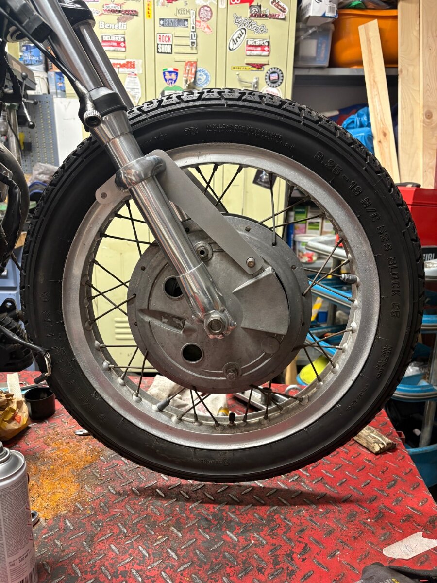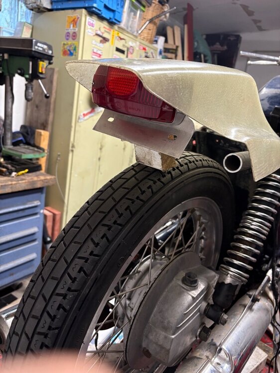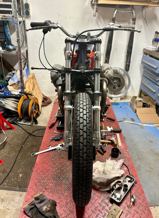Guten Abend beisammen, Langsam ernährt sich das Eichhörnchen: Gabelbrücken der kleinen Modelle, in diesem Falle von einer Nevada aufgrund des schmaleren Augenmaßes, von 34,75mm auf 35mm ausgefräst um die Ceriani GP35 Gabel verbauen zu können. Kurzes Lenkkopf Tonti Joch von der T3 eingepresst. Grimeca 230mm Doppelduplex Trommelbremse passt nun auch zwischen die Holme. Lenker einer Benelli 250 2c - schön schmal und passend gekröpft. Seitendeckel sind abgeändert auch von der Benelli. Schöne alte Amaturen von Cuppini. Die Lampenhalter sind übrigens Originale Cerianis aus dem Cross-Bereich. Waren wohl an alten KTMs etc. CEV Rücklicht einer alten V7 700 passgenau unters Flat Track Heck inkl. Kennzeichenbeleuchtung und Rückstrahler. Blinker wird sie nur an den Lenkerenden haben. Tank ist lediglich beispielhaft aufgesetzt um mal einen schmalen flachen Tank drauf zu haben. Tank wird Einzelanfertigung eben im Style der XR750 (in etwa) sein. Motorrad wird extra flach, kam natürlich vorne ordentlich runter durch die GP Gabel. Hinten sind nun Stoßdämpfer mit einer Länge mit 310mm verbaut. Es werden wohl schöne Konis in 315mm… mit dem schmalen Tank kommt von vorne gesehen der Motor super zur geltung. Alles erstmal nur dass sie rollt 🙂 und die Unordnung getrost ignorieren - ich brauch das: Order out of Chaos1 point