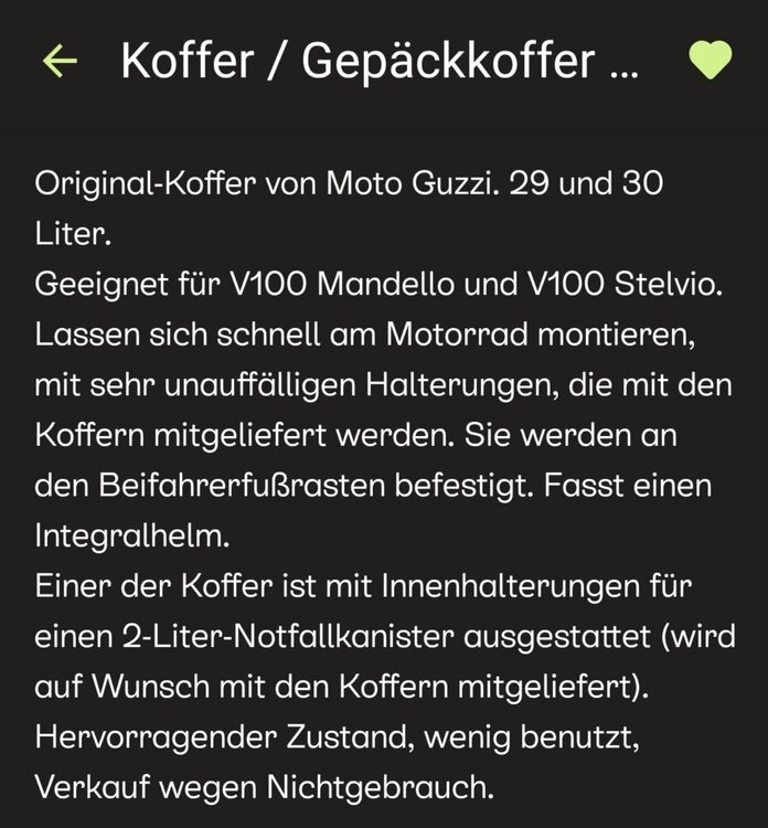 Achtung, Achtung ! bei Kleinanzeigen wurden schon mehrfach Fake-Koffer für die Mandello / Stelvio angeboten. Der Preis ist immer verlockend selbst wenn man schon Koffer hat. Beide Koffer werden für 150.- oder 200.- Euro angepriesen. Kurz danach ist der Account gesperrt. Ein Bekannter von mir erzählte das es für die BMW R 1300 GS ebenfalls unverschämt günstige Koffer zu kaufen gibt. Er hatte sie abgespeichert, festgestellt das es immer wieder die gleichen Foto`s sind aber ein anderer Account und jedes mal eine andere Stadt. Also Vorsicht !!!!!1 point