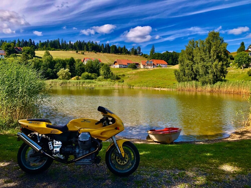 Heute sollen die Bilder meiner ersten 1100 Sport in Vordegrund stehen. Nachdem ich mit der Sitzposition auf der V11 Le Mans etwas Probleme hatte gefiel es meiner Hüfte auf der 1100 Sport besser. Die Runde führte mit zwei Kollegen über den Hotzenwald, den Schwarzwald und das Markgräflerland. Erster Stop war an einem Kohlemeiler in Dachsberg. Einmal im Jahr wird dieser Brauch dort noch gelebt. Nähere Infos würde es hier geben. https://sogesehen.blog/2025/08/24/schwarzes-gold/ Wir wurden jedenfalls freudig aufgenommen und alle unsere Fragen wurden bei Kaffee gerne beantwortet. Vorbei an einem idyllischen Weiher ( mein Lieblingsplatz, auch zum Baden )... ging es weiter über die Höhen des Hotzenwaldes. Von dort ist es nur eine kurze Überfahrt zum Schwarzwald mit seinen typischen Häusern... und dem Wasserrad das ich so liebe und mich immer wieder zum Fotostop verleitet. Über die entlegenen Dörfler des kleinen Wiesentals tourte ich mit dem Postmopped in Richtung Heimat. Zuhause angekommen und abgekühlt erwartete die Sport eine kleine Wäsche . ( mit tierischer Unterstützung) Sauber und geschmiert steht sie wieder neben dem kleinen Bruder in der Garage. Diese musste sie aber leider mittlerweile wieder verlassen und Platz für die rote 1100 Corsa machen.(Der Platz ist leider begrenzt ) Der Schwarzwald ist zwar mittlerweile ein wenig zur Problemzone wegen zu vieler und zu lauter Motorräder geworden aber Fahrer/innen mit einer Freude an der schönen Natur und entsprechender Rücksicht auf die Anwohner sind dort immer herzlich willkommen. Ich hoffe der Beitrag langweilte euch nicht und ihr hattet Freude an der Mischung aus Bildern und Information. LG Uwe7 points
