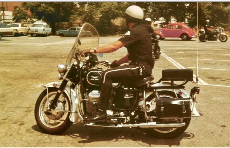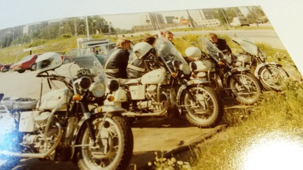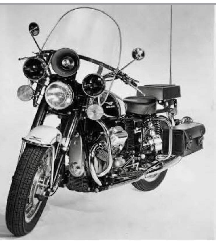 Moto Guzzi Eldorado Police 1972 bis 1974 damit hatte Moto Guzzi es geschafft: als einziger Anbieter und Ausrüster für Polizei Motorräder in den USA wo normalerweise nur Harley Davidson am Markt war; für Guzzi ein Riesenerfolg und ein hoher Image Wert. Der erfolgreiche Importeur Berliner schaffte es erstmalig mit der V7 750 in Los Angeles zu starten, mit der V7 850 hatte man das richtige Motorrad, was die amerik. Polzei haben wollte. Sie hatte die richtige Leistung und war wesentlich handlicher zu fahren als die Harley`s. Hier Bilder von der 750er (Foto aus Helsinki in 1972) von mir in 1972 aufgenommen, als ich mit meiner V7/750 in Finnland nach Imatra gefahren bin. und die 850er in Amerika.
