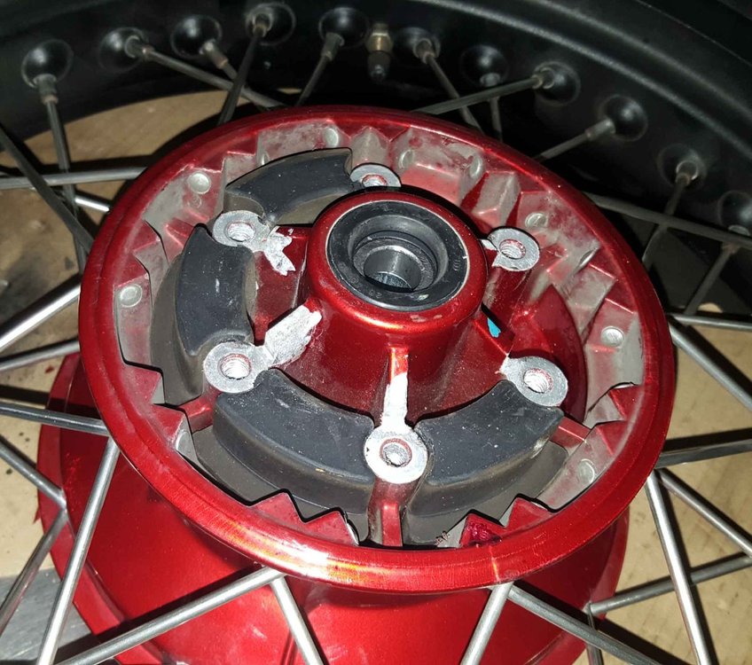 Zum Glück sind hauptsächlich die Naben der Felgen betroffen, der Rahmen ist noch OK. Sollten wir das mit der Farbe für die Naben nicht richtig hinbekommen, habe ich mich mittlerweile entschlossen diese dann in Schwarz zu lackieren. Die VR`7 Racer der neueren Generation (die meinen Geschmack zwar nicht mehr treffen) haben diese auch nicht mehr in rot. -