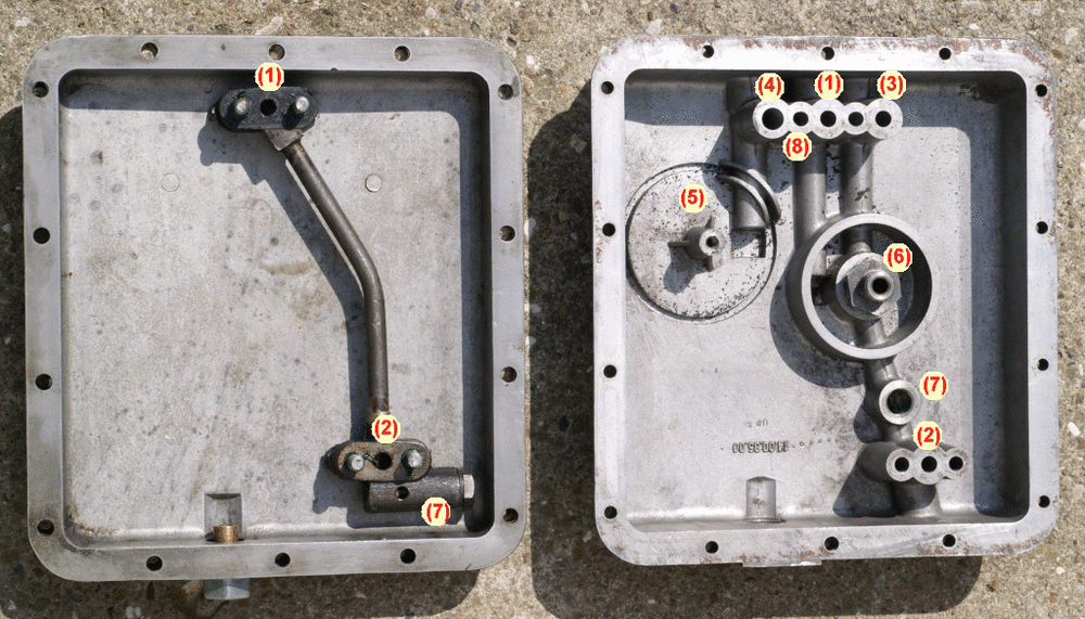 Anbei ein Vorschlag wie der Umbau ohne Zerspanen des Motorgehäuses zu bewerkstelligen wäre - verwendbar für alle grossen V-Motoren ohne Ölfilterung - das ganze soll eine Anregung sein - keine detailierte Bauanleitung. Bildnummern 1. von der Ölpumpe 2. zum hinteren Hauptlager 3. verschließen (zum vorderen Hauptlager) 4. verschließen (Ansaugung aus Ölsieb) 5. Ölsieb 6. Ölfilter 7. Ölüberdruckventil 8. die vier Durchgangslöcher aufbohren auf 8,5 mm für M8-Schrauben Das originale V7-Ölsieb (alias Hasendraht) kollidiert leider mit dem T3-Ölfilter. Idee: den Flansch des alten V7-Siebes zweck Weiterverwendung absägen, ein Kupferröhrchen in den Flansch einlöten, welches durch eine Bohrung des T3-Ölsiebes geführt wird. Die Bohrung im T3-Ölsieb mit einer ölfesten Gummidurchführung o.ä. dichten. Bedingt durch den Druckunterschied vor und nach der Ölfilterpatrone ist der Öldruck im vorderen Hauptlager etwas höher als im hinteren Hauptlager. Gruss Ralf