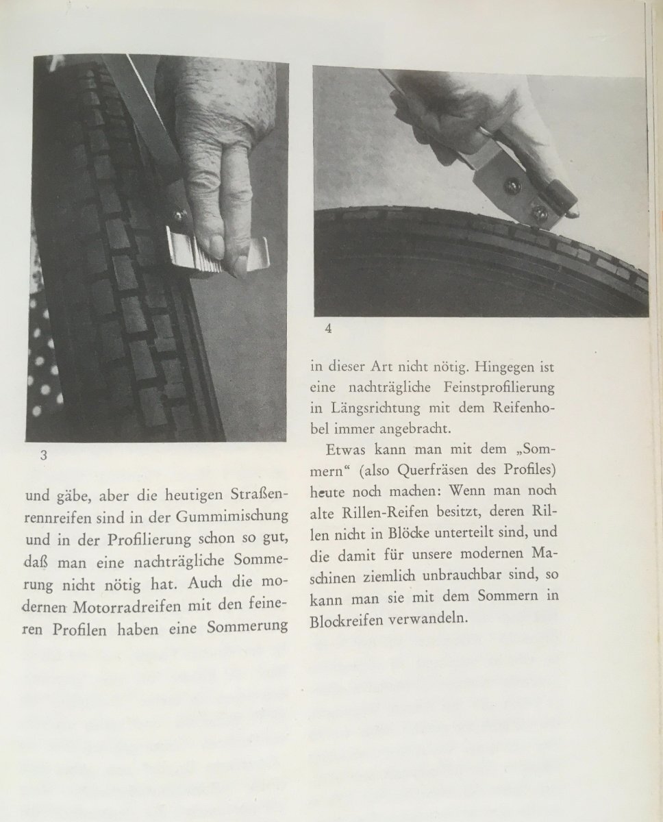 ...auch der "Reifenhobel" und dessen Anwendung ist dort beschrieben. Ich selbst kannte diesen nur von Erzählungen alter Biker (als ich noch jung war). Ob ein "Tüv-Prüfer" dieser "Reifenoptimierung" heute noch zustimmt? 😅