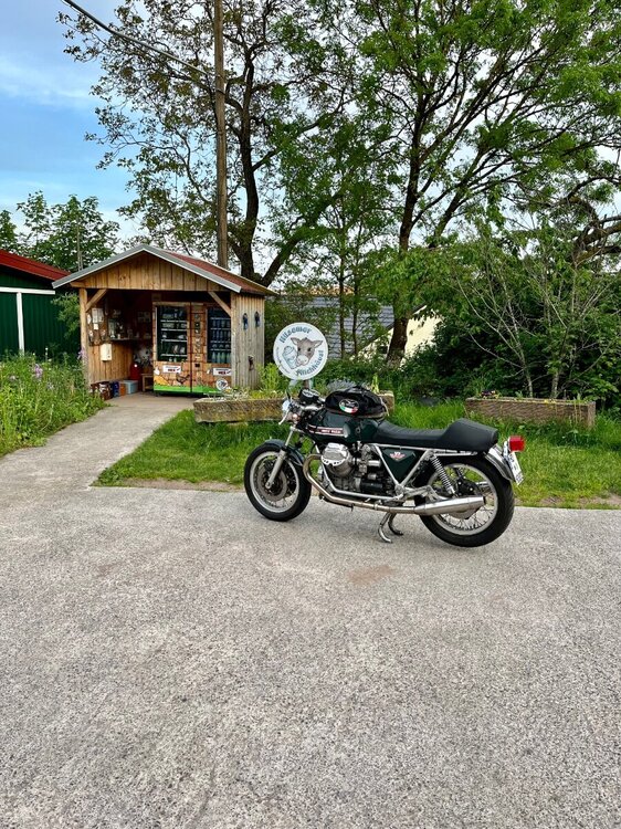 Guten morgen zusammen und schönen Sonntag, zunächst einmal vielen Dank für die positive Resonanz! Auch die persönlichen Komplimente weiß ich wirklich sehr zu schätzen. In meinem Alter hat man nicht allzuviele Gleichgesinnte um sich herum. Die fahren zu meist übermotorisierte Selbstmordinstrumente (und davon alle drei Jahre ein anderes), haben einen Brot/Butter-Japaner oder eben fahren sie kaum, sondern haben sich für die dreimal im Jahr anstehende zwei Stundenausfahrt eine amerikanische Maschiene mit falschherum eingebautem V2 in die Garage gestellt. Wobei ich auch am ehesten an einem Cruiser/Bobber interessiert wäre - als nächstes. Muss ich zugeben… Als Disclaimer: Und alles hier geschriebene nicht falsch verstehen. Jedem das Seine! Ist nun nicht wertend gemeint sondern sarkastisch und ironisch. Hauptsache Zweirad - habe keinen Marken Hass und witzele natürlich gerne im Motorradfahrerkreis. Als Guzzi-Fan bekommt man ja auch genug ab. Wer einsteckt, darf auch austeilen @Ironbuttselbstvetständlich kannst du die Phrase nutzen. Sie stammt auch nicht hundertprozentig von mir. Der gesamte Satz lautet wie folgt und kommt zur Hälfte wohl von Jay Leno und mir er hat sowas ähnliches anscheinend mal (auf English natürlich) gesagt und ich habe es um- und ab-gewandelt. „Eine Werkstatt sollte der Platz sein, wo ein Mann in Frieden mit sich selbst sein kann. An dem man sich beruhigen und entspannen kann. Dann wird die Restaurierung eines klassischen Fahrzeuges eine Form der Meditation. Eine Werkstatt ist kein Luxus. Wir brauchen eine Werkstatt, um unsere Hände zu beschäftigen, unseren Kopf zur Ruhe zu bringen und uns mit etwas zu verbinden, das über den Alltag hinausgeht.“ @Eine GuzziZwei alte Fahrrädchen habe ich auch neben dem obligatorischen modernen MTB(kein E-Bike / bin bekennender Vollverweigerer). ein 1972er Kettrad Pirat Bonanza Olympia-Edition ein 70er Jahre Raleigh Rennrad mit Reynold 531 Tubes Auch dafür kann ich mich begeistern. Machen auch was her so alte italienische Rennräder und Campagnolo-Teile. Bei mir werden es mehr unmotorisierte Zweiräder aber nicht werden. Die Tage werde ich als erstes einmal in einem Beitrag davon berichten, wie meine V100 sich bereits direkt nach Abholung schräg anhörte und daraufhin das Ventilspiel kontrolliert und eingestellt wurde. Jetzt sollten ja bereits einige zur Inspektion müssen, bei welcher die Ventilspielprüfung vorgeschrieben ist - ich meine 16tkm. Das Spiel zu überprüfen ist simpel! Sollte es aber eingestellt werden müssen, so muss das halbe Fahrzeug und der halbe Motor zerlegt werden. Für mich war das interessant zu sehen, da ich ja wie bereits geschildert, an der Weiterentwicklung von Maschienen bzw. der Industrie interessiert bin. Ich aus dem Grund auch die erste wassergekühlte Guzzi unbedingt haben wollte. Schaut man sich aber eben nur Beispielhaft den Prozess des Ventilspieleinstellens an, so muss man doch die alte solide Technik würdigen! ein Foto als Teaser ps.: noch niemand aus Mannheimer Umgebung/Rhein-Neckar/Odenwald etwas zurückgemeldet. Grüße in die Republik!