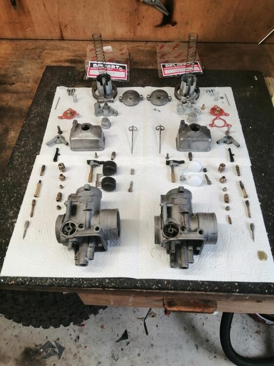 Rick_BG Posted September 13, 2023 Author Share Posted September 13, 2023 Die Elektrik ist im groben fertig, daher wende ich mich dem Thema Vergaser zu. Ein Bild vom Ausgangszustand lade ich bewusst nochmal hoch. Die Vergaser haben eigentlich nichts mit Guzzi zu tun, sondern stammen aus einer Ducati (ich glaube 600er Pantah). An der "Alten Schule" hab ich noch einen 750 S Besitzer getroffen, der hatte die auch drauf. Mein unbekannter Tuner hatte diese Vergaser mit Nylonhülsen befestigt, die natürlich geschmolzen waren. Das sollte noch ein lösbares Problem werden! 2 Quote Link to comment Share on other sites More sharing options...